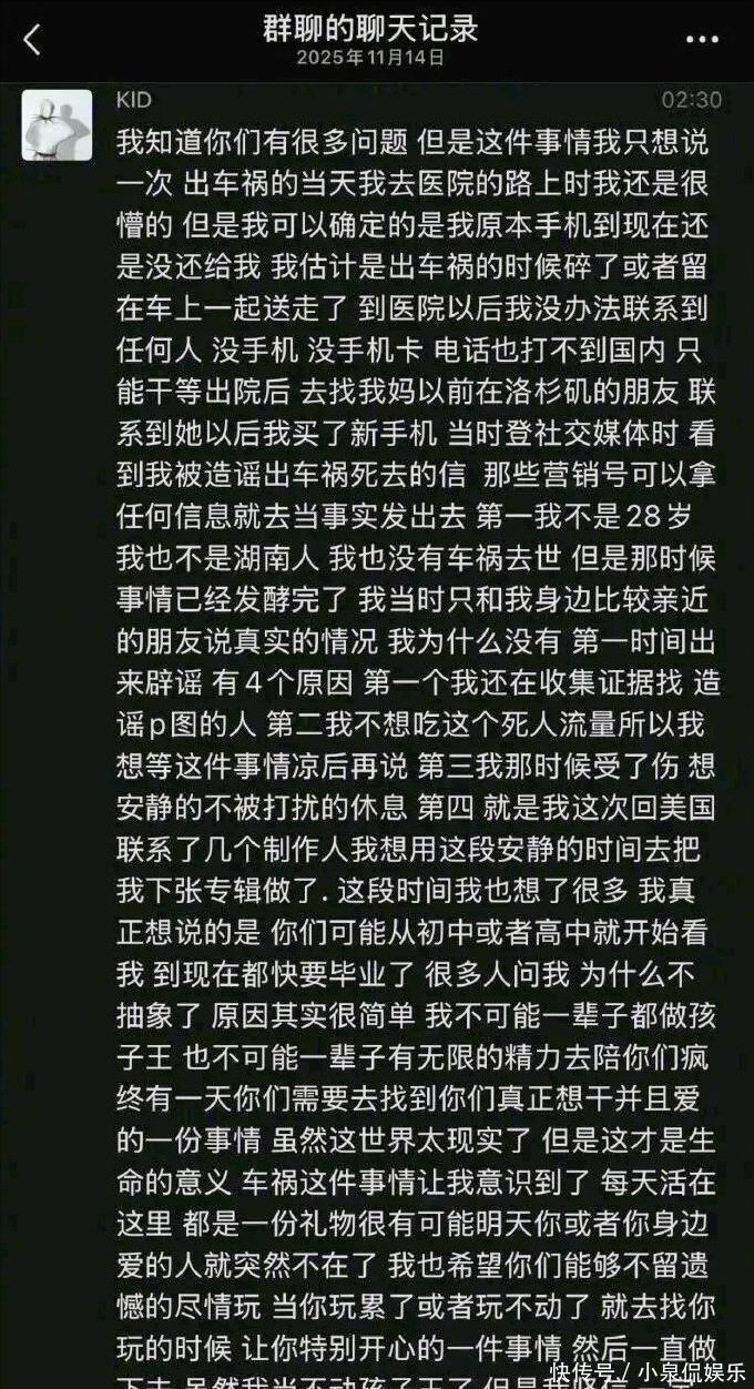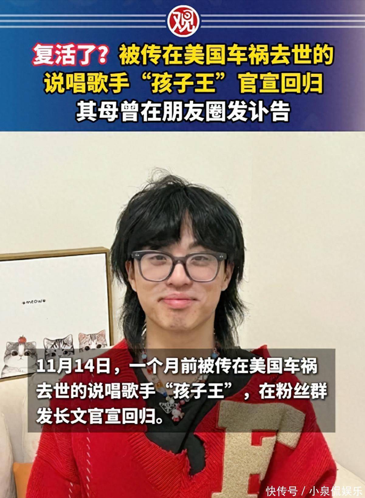 这应该是2025年娱乐圈最抽象的一幕了,一个月前被官宣“车祸去世”的说唱歌手孩子王,11月14日凌晨突然在粉丝群发长文,告诉大家“我回来了!”