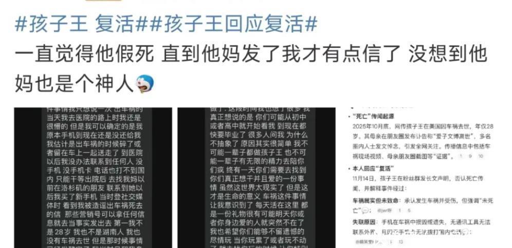 “复活”真相:消失的30天他在做什么11月14日,孩子王突然“复活”。他在粉丝群发布长文解释:车祸后手机损毁无法联系外界,等看到自己“被死亡”的消息时,传闻早已发酵得无法控制。